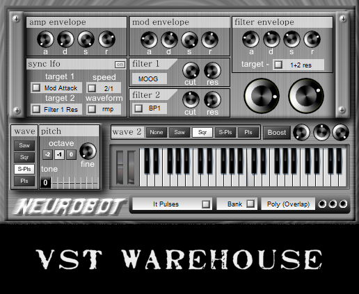 Neurobot plugin, it's a very simple bass synthesizer plugin moded with SynthEdit. This plugin is designed on phase distortion oscillation, counts with Amp Envelope, Modulation Envelope and Filter Envelope. Simple based waveforms like Square, Saw, Pulse and Saw-Pulse are the core of this plugin.